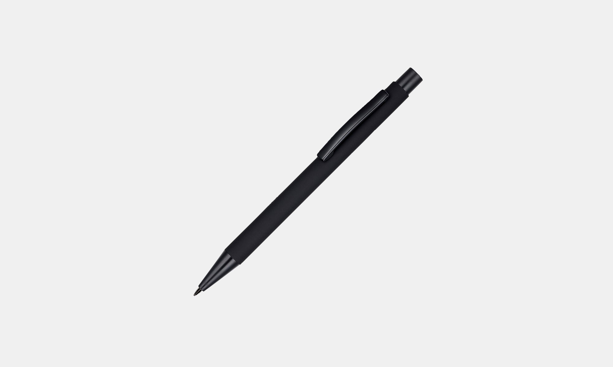 Travis Noir Kugelschreiber – ein superschlanker, ganz in Schwarz gehaltener Kugelschreiber mit weicher Haptik, schwarzer Tinte und dem Markennamen Borg & Overström