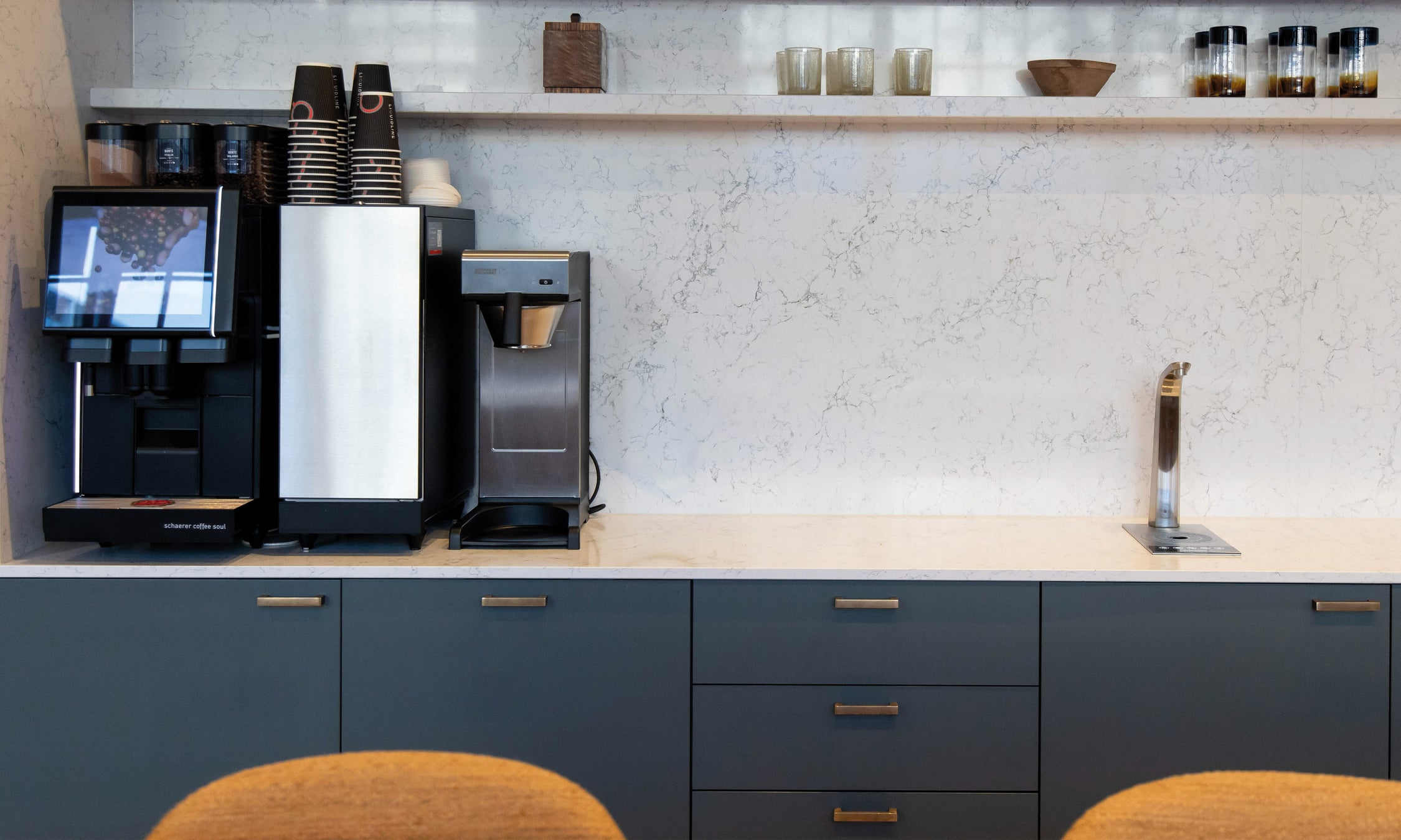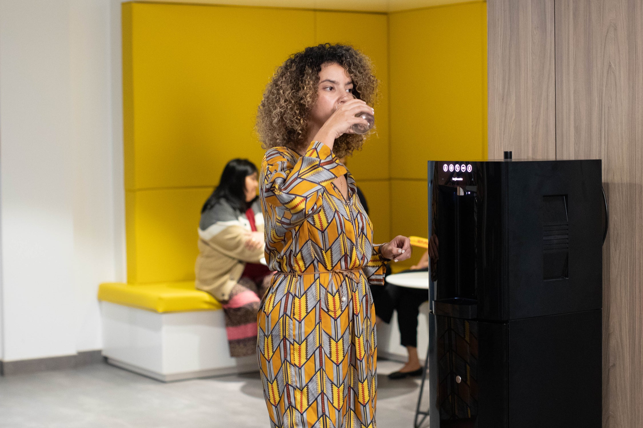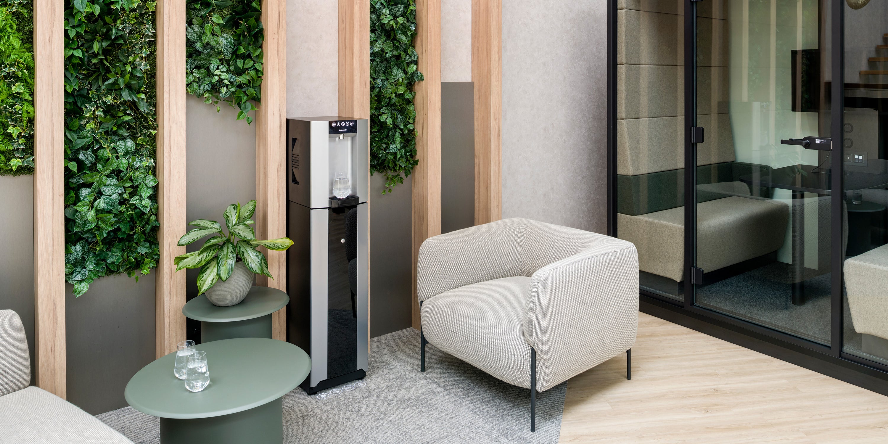 Die Mitarbeiter können gekühltes, sprudelndes und heißes gefiltertes Wasser aus eleganten Multifunktionsarmaturen genießen, die sich harmonisch in die Gemeinschaftsräume einfügen. Diese Ausstattung macht Wasserkocher und Einwegflaschen überflüssig und fördert ein durchdachtes und nachhaltiges Arbeitsumfeld.