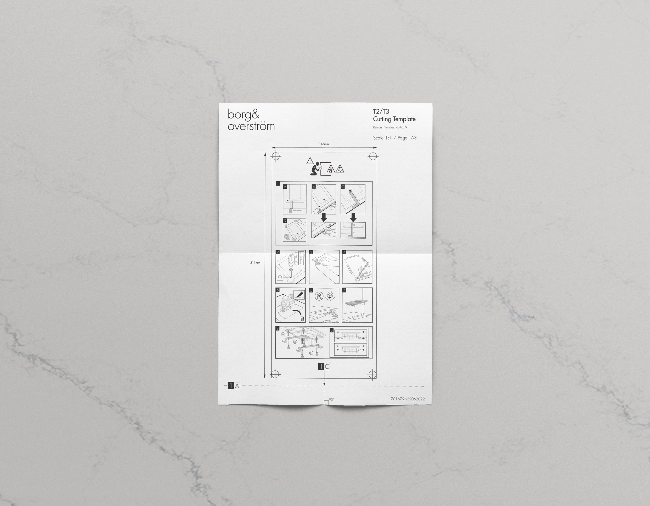 Jeder T2 und T3 wird mit einer Schablone zur einfachen Montage geliefert. Wenn Sie Ihre Arbeitsfläche vor der Lieferung Ihres Armaturensystems zuschneiden möchten, können Sie vorab eine Schablone bestellen.