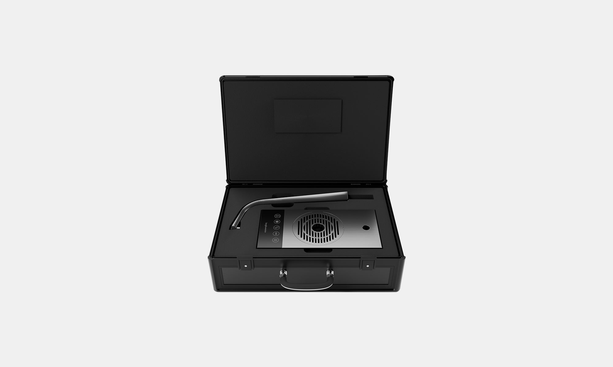 Voici le kit de démonstration T3 Monofit. Il comprend : un robinet T3 Monofit argenté en deux parties et un bac récupérateur, tuyaux retirés. Le tout est présenté dans un flight case de marque haut de gamme.